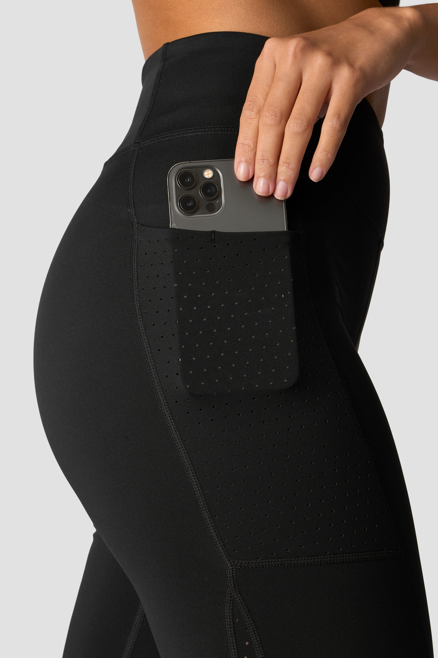 Løbetights med lommer til telefonen. Materialet er meget strækbart med fugttransporterende egenskaber samt laserudskårne perforeringer for ventilation. Sidelommer holder dine ejendele hos dig. Tynd elastik i taljen for at holde tightsene på plads.